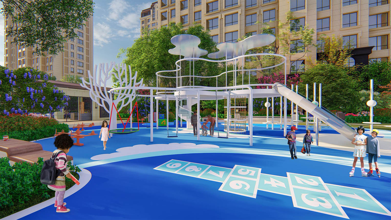 亲子乐园景观以“天空之城” 为设计主题,遨游于其中,感受不同成长阶段的儿童乐趣并将之珍藏在记忆中,