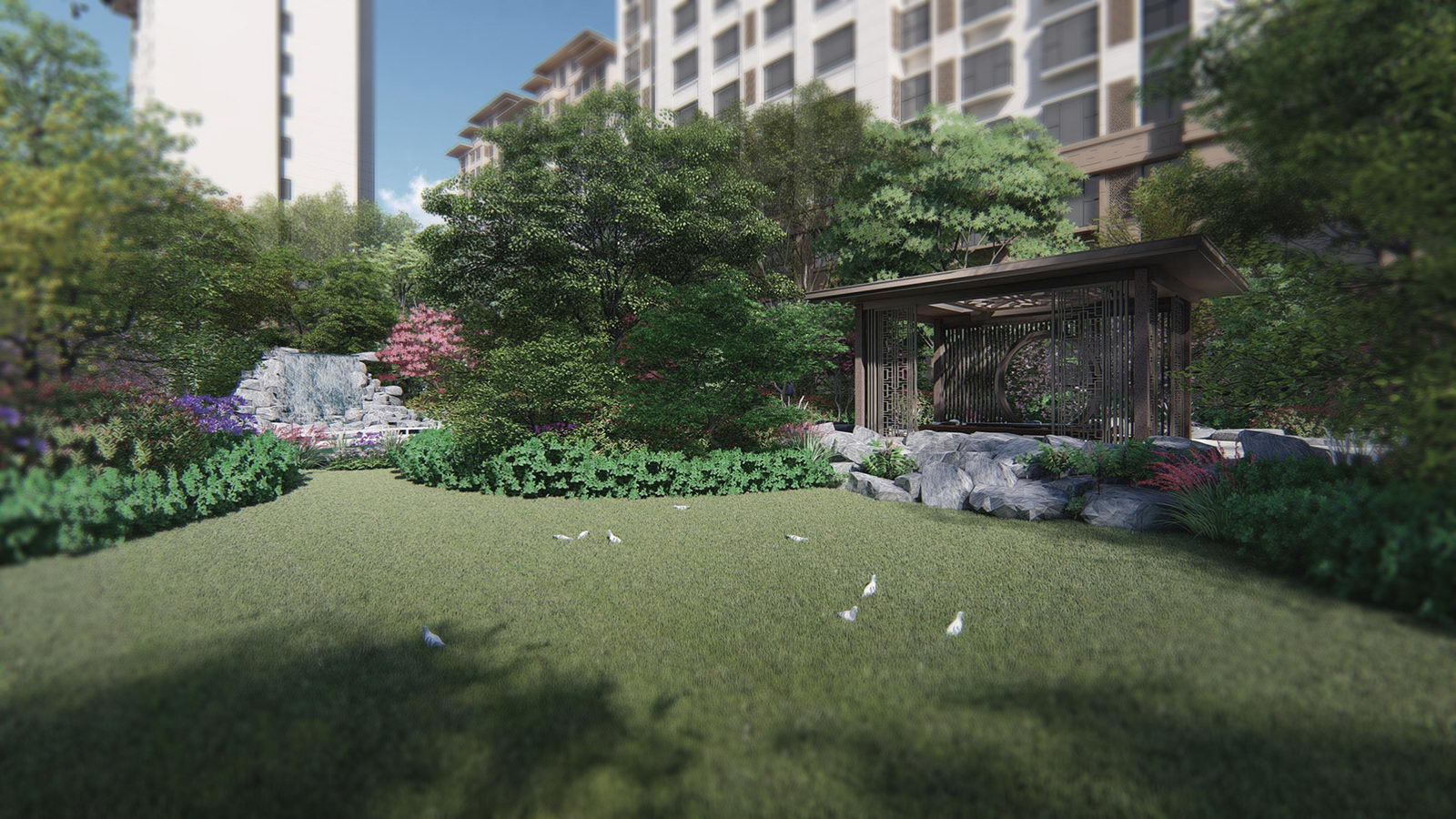 镜面水景轻灵、优雅、致韵;双排四座宫灯雕琢万字符,寓意前程万福。