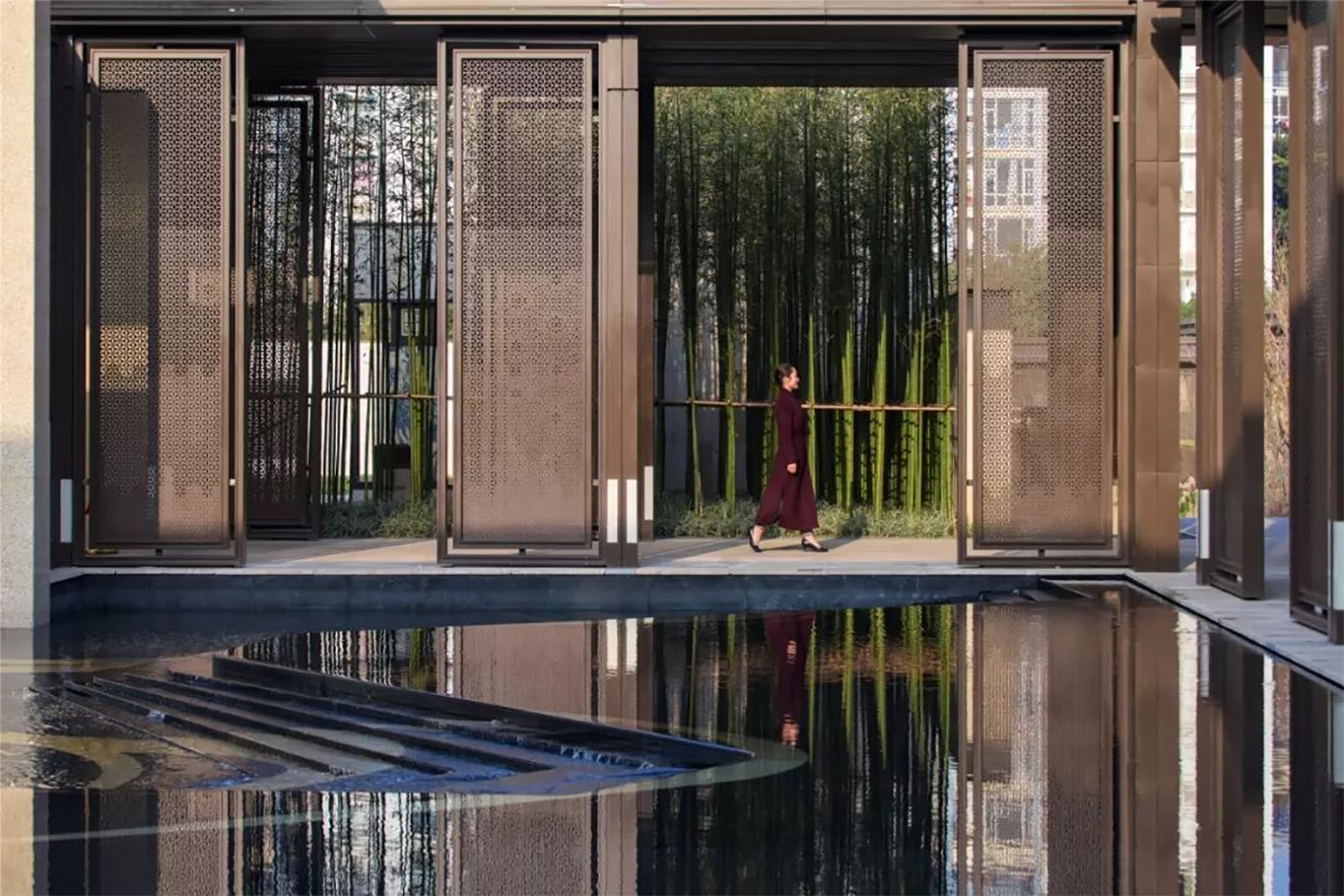 售楼处前场以砚石流墨为视觉焦点,黑色肌理犹如一方砚台,水景层层叠叠,如水墨轻流,水墨文铺装如丹青一抹烟雨浓,墨香氤氲气韵生,不只是宣纸上走笔才能晕染出水墨的虚幻与自由。