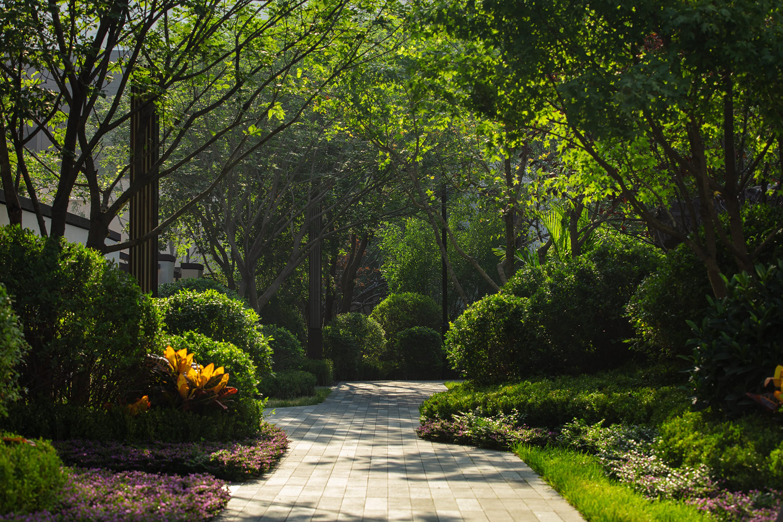 灰白砂石与草坡带来的景观明暗变化,缥缈云烟画卷开,山峰染墨净尘埃,山水画卷之后呈现盛世华府清净质感。白沙入雾绿岛如云,砂石又可为砂庭出入路径,又自成一道风景。